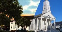 View of the First Presbyterian Church in downtown Tallahassee as it appeared in the 1940s compared to today. The once small-town landmark with its classic white steeple and surrounding oak trees remains a familiar sight, standing tall in the heart of the city as one of Tallahassee's oldest churches.